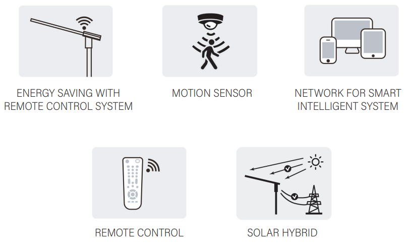 אפשרויות הזמנה מנגנון חכם להפעלה / כיבוי אוטומטי של גוף תאורה. מערכת שליטה ובקרה אל חוטית עם תשתית רדיו או סלולר. מערכת היברידית עם הזנה חלופית מקו חשמל לגיבוי הסוללה.