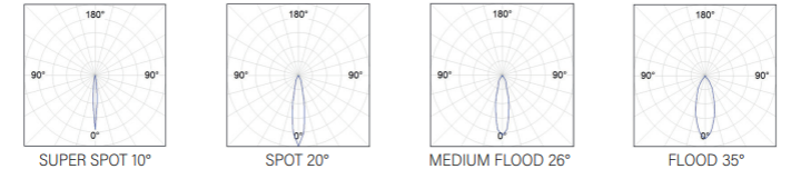 מערכת אופטית Superspot 10º, Spot 16º, Medium flood 25º, Flood 34º