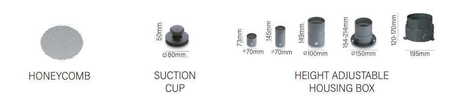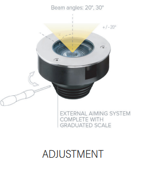 אפשרויות התקנה: שקוע קרקע עם יכולת כיוונון 20° של החלק האופטי ללא פתיחת גוף התאורה בדגמים 100AD / 140AD.