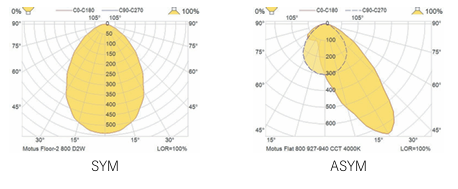 מערכת אופטית פיזור פוטומטרי סימטרי עם מפזר אופלי עבור דגם MINI+TABLE+FLOOR+WALL. פיזור פוטומטרי אסימטרי עם כיסוי שקוף עבור דגם FLAT.